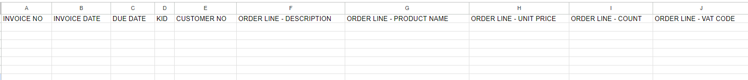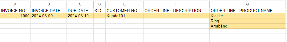 Du vil se at kolonnene A-J er fylt ut med ulike overskrifter. Alle disse er påkrevd å fylle ut, med unntak av kolonne D “KID” og kolonne F “Order line - description” som kan stå tomme.