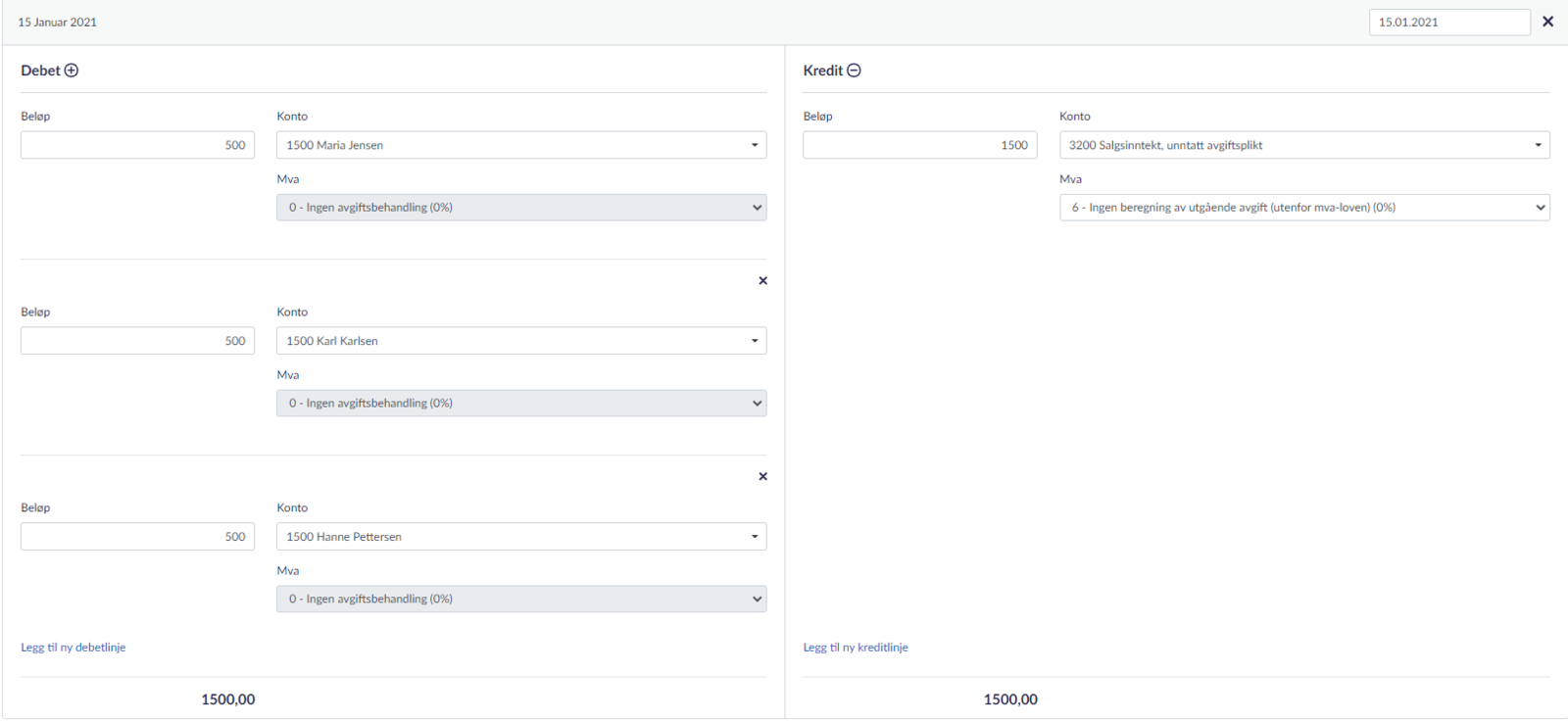 Her kommer et eksempel på hvordan dette skal føres. Merk at dette eksempelet tar for seg salg av kurs hvor bedriften ikke er mva-registrert. Hvis ditt selskap er mva-registrert, må du huske å velge riktig mva her: