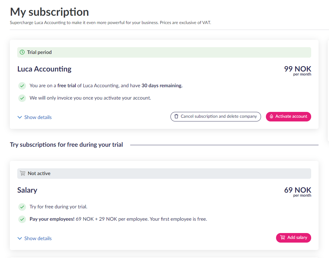 Once the trial period has ended, activate your account in order to continue using our accounting system. This can be done from “My subscription” in the settings, which is also where you can add the optional modules for salary or projects.
