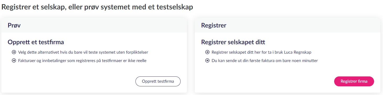 We will now send you an e-mail, which you will need to verify in order to finish creating your account. After verifying your e-mail, you will be asked to either create a test company (Prøv - Opprett et testfirma) or register your actual company (Registrer - Registrer selskapet ditt).