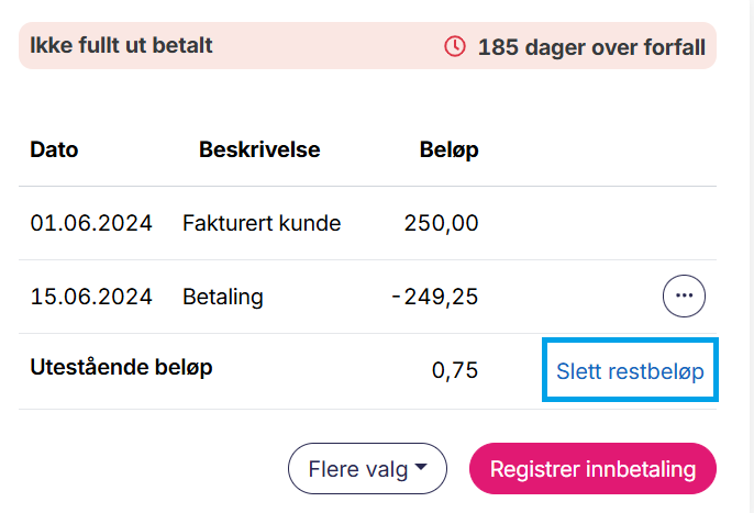 Du har sendt en faktura på 250 kroner. Kunden din betaler bare 249,25 kroner (altså 0,75 for lite) og du får en differanse på 0,75. I stedet for å kreve inn et så lite beløp, sletter du restbeløpet. Luca vil automatisk registrere øreavrundingen mot konto 7740 - Øredifferanser, for deg.