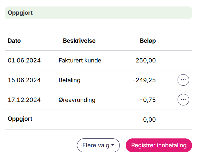 Fakturaen endrer status til oppgjort, og du vil se en ny linje Øreavrunding.
