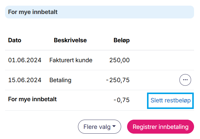 Du har sendt en faktura på 250. Kunden din betaler 250,75 kroner (altså 0,75 for mye) og du får en differanse på 0,75. Dette er vanligvis ikke et beløp som kunden vil kreve å få tilbakebetalt, og du sletter restbeløpet. Luca vil automatisk registrere øreavrundingen mot konto 7740 - Øredifferanser, for deg.