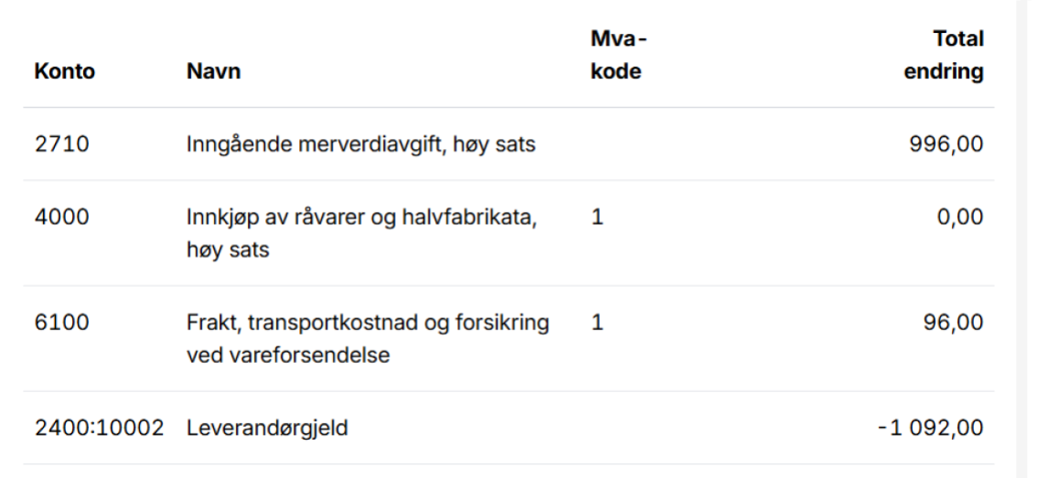 Legg merke til at total endring på varekostnadskontoen (4000) her = 0. Dette er fordi denne fakturaen fra speditøren ikke er på selve varen du kjøpte, så det er ingen endring i varekostnadskontoen. Den kostnaden har blitt registrert på fakturaen du har fått fra den tyske leverandøren (steg 1).