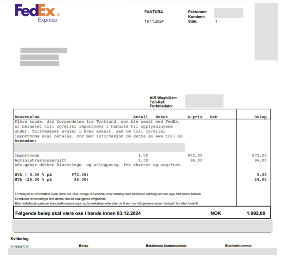 NB: Hvis dette kjøpet inkluderer importmoms (VOEC), skal du ikke betale importmoms til speditøren. Du kan likevel motta ekspeditørfaktura for andre importavgifter (eks. Toll og administrasjonsavgift)