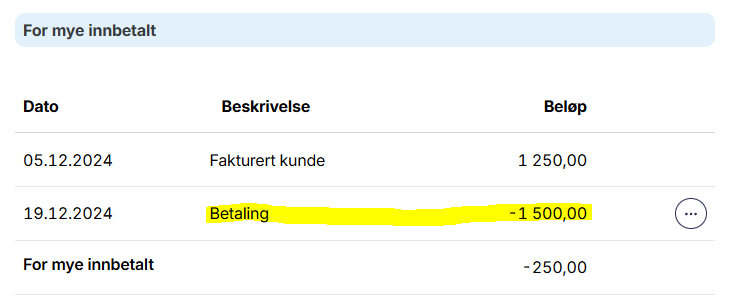Det kan jo hende du noen ganger mottar en betaling som er høyere enn hva kunden skylder deg. Ja, kunden har rett og slett betalt for mye. I et slikt tilfelle må du registrere fakturaen som for mye innbetalt, og betale tilbake kunden din.