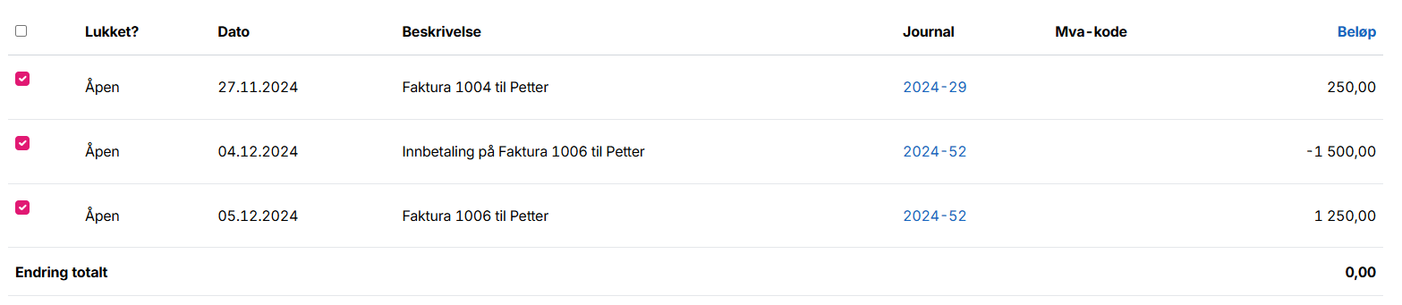 På denne måten kobles alle kundefakturaene til den innbetalingen du har registrert, og fakturaene endrer status til oppgjort.