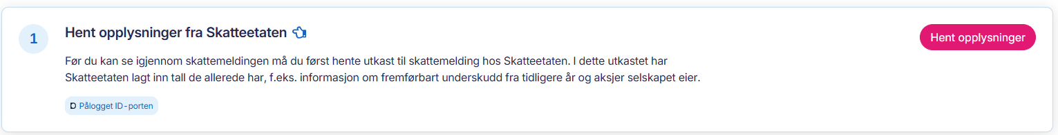 Før du kan starte utfyllingen av skattemeldingen, må du hente utkastet fra Skatteetaten. Dette utkastet inneholder forhåndsutfylt informasjon som Skatteetaten allerede har om selskapet ditt, for eksempel fremførbart underskudd fra tidligere år og aksjer selskapet eier. Denne informasjonen fylles vanligvis ut i starten av mars, så vi anbefaler å vente med innlevering til litt ut i mars.