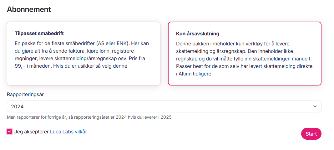Lurer du på hvordan du kan få levert skattemeldingen for din bedrift når du ikke har regnskap i Luca? Selv om det er enklere å la oss forhåndsutfylle skattemeldingen basert på regnskapet ført i Luca, er det kanskje noen som fortsatt fører regnskapet i et regneark, eller av andre grunner velger å føre regnskapet i andre systemer. Vi tilbyr en løsning for de som kun velger å levere årsavslutningen med oss: “Kun Årsavslutning”.