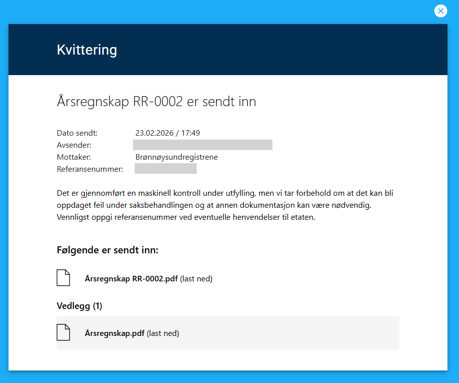 3. Kvittering for signert og innlevert årsregnskap vil se slik ut: