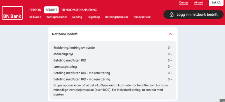Vi mener at BN Bank er det beste alternativet for småbedrifter. For det første krever BN Bank både færre og lavere gebyrer enn nesten alle konkurrenter. For det andre er dette en av bankene som tar imot nye bedriftskunder med relativt åpne armer. Vanligvis går det raskt å få etablert kundeforholdet, også for selskap under etablering.