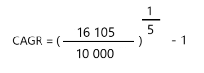 La oss si at du investerer 10 000 kroner i et fond, og etter 5 år har verdien vokst til 16 105 kroner. For å finne CAGR,