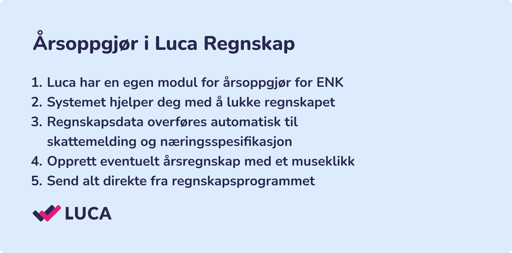 I Luca overfører oppretter årsregnskapet med et museklikk i samme vendinga som du fikser skattemeldingen og næringsspesifikasjonen. Årsregnskapet kan også sendes direkte til Regnskapsregisteret, og du slipper å kaste bort tid på manuell innlevering.