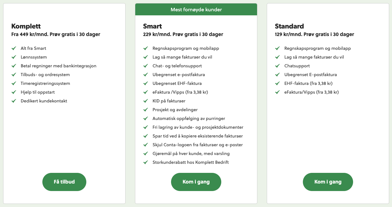 - Smart – Bygger videre på Standard-pakken og inkluderer blant annet Kid på faktura, prosjektverktøy, purringer, lagring av dokumenter og varslinger