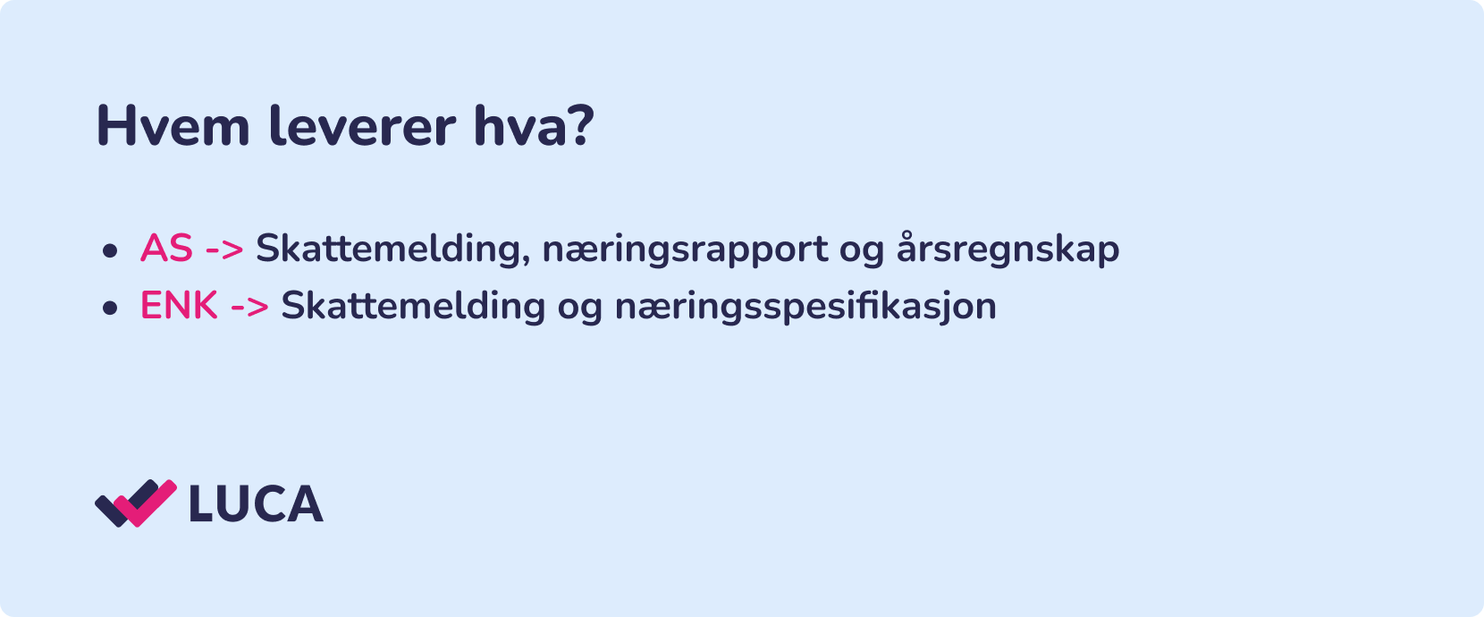 Luca har en modul som hjelper deg med årsavslutningen for AS og ENK - en kjekk løsning for de som fører regnskapet selv. Du kan også få hjelp fra autorisert [regnskapsfører](/ordboken/regnskapsforer) inne i systemet.