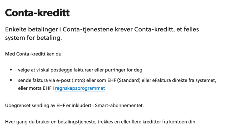 For eksempel kan du forhåndsbetale for 10 EHF-fakturaer, og da koster hver enkelt av de 8,90 kroner. Forhåndsbetaler du for 500 i slengen blir prisen redusert til 3,38 kroner per stykk. Conta-kreditt har en holdbarhet på 24 måneder, og du får ikke tilbake penger du ikke har brukt.