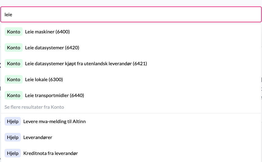 Kontohjelpen viser deg relevante kontonumre for stikkordet du søker på. Du får også foreslått hjelpeartikler som kan være nyttige i forhold til det du lurte på.
