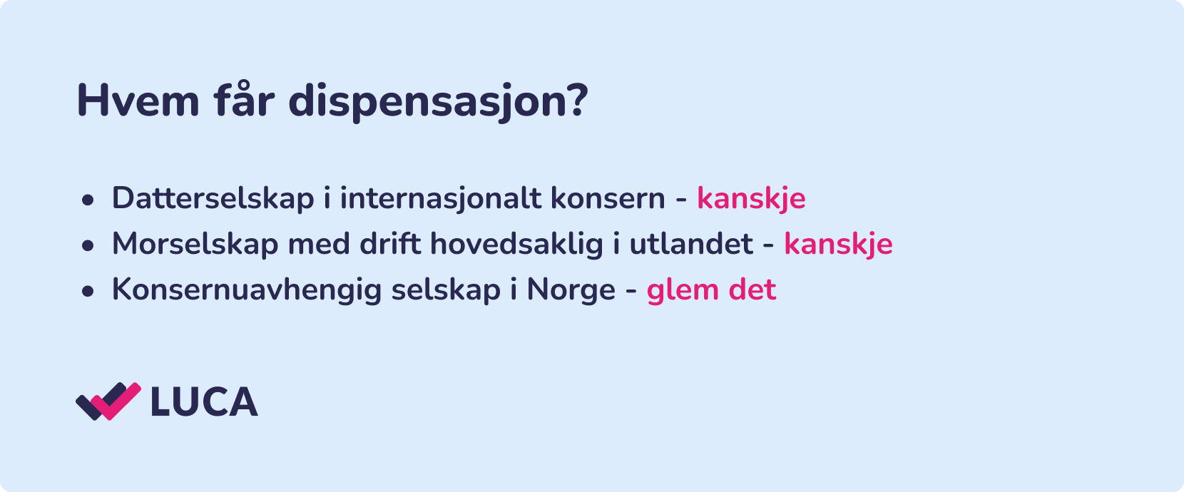 - Bekreftelse på at morselskapet utarbeider et konsernregnskap som innbefatter det norske selskapet som søker om dispensasjon.